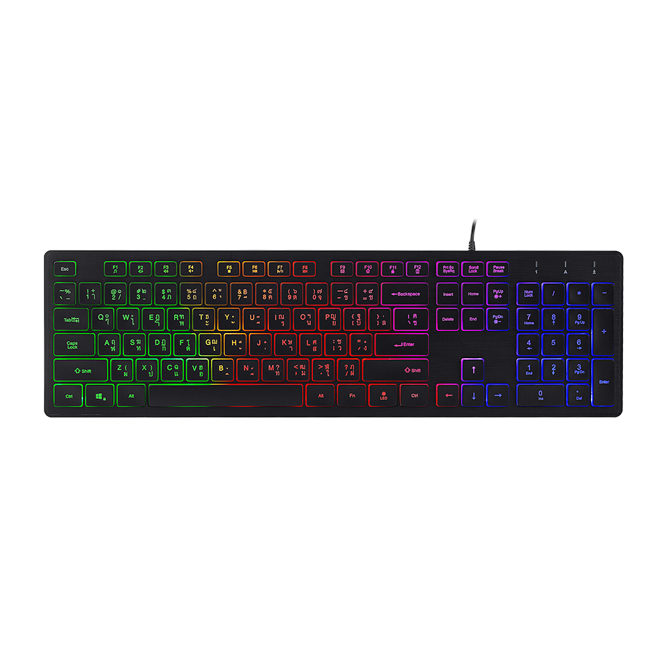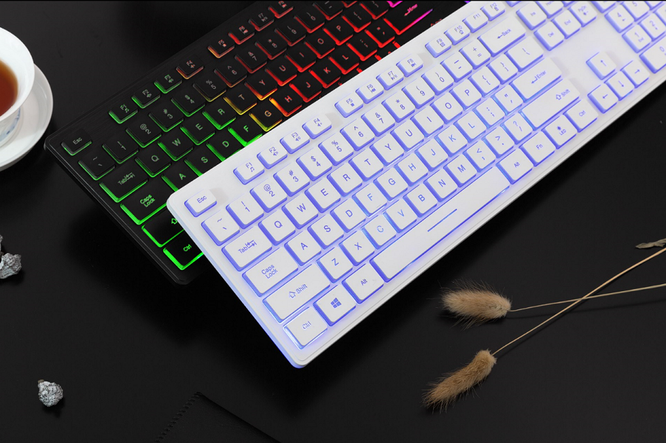 ● Plastic housing ● Rainbow / 3 / 7 color led light for optional ● Durable 10 million times key life ● Multimedia keys for easy access, via FN+ (F1-F12) ● Net weight: approx. 408.5 g ● Keyboard dimensions: approx.: 439*125.8*29.5 mm ●Multiple language versions available